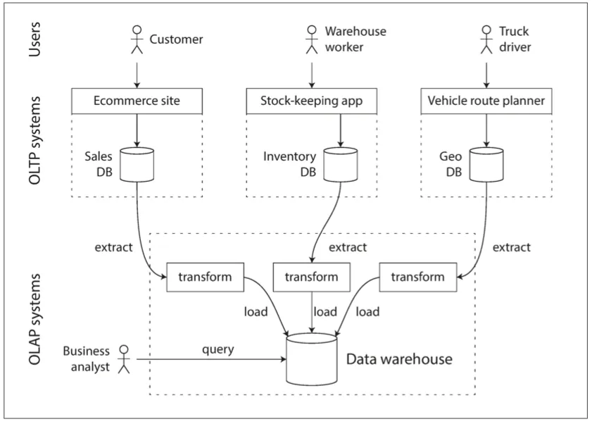 그래서 비즈니스 분석가의 OLAP 쿼리를 꺼려한다. 왜냐하면 dataset 의 많은 부분을 스캔해야 하는 쿼리와 비즈니스의 트랜잭션을 동시에 실행할 경우 DB에 성능 저하가 발생하기 때문이다.