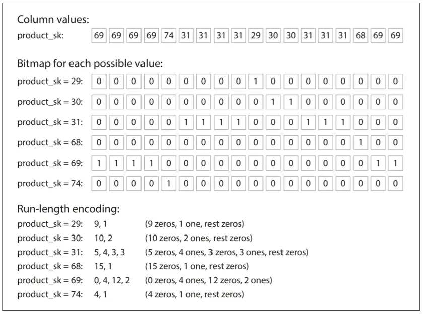 그러면 n개의 고유 값을 가진 column(69,69,69,69,74,31,31...) 을 가져와 n개의 개별 비트맵으로 변환하는데(product_sk 별 비트맵을 따로 가짐) 만약 row가 해당 값을 가지면 비트는 1이고 그렇지 않으면 0 이다.