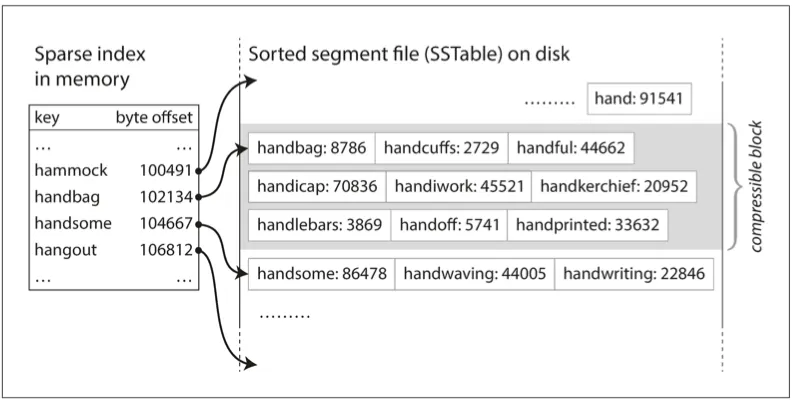 읽기 요청은 요청 범위 내에서 key-value 를 스캔해야 한다. 따라서 record를 블록으로 그룹화 하고 디스크에 쓰기 전에 압축한다. 그러면 key는 압축된 블록의 시작을 가리키게 된다.