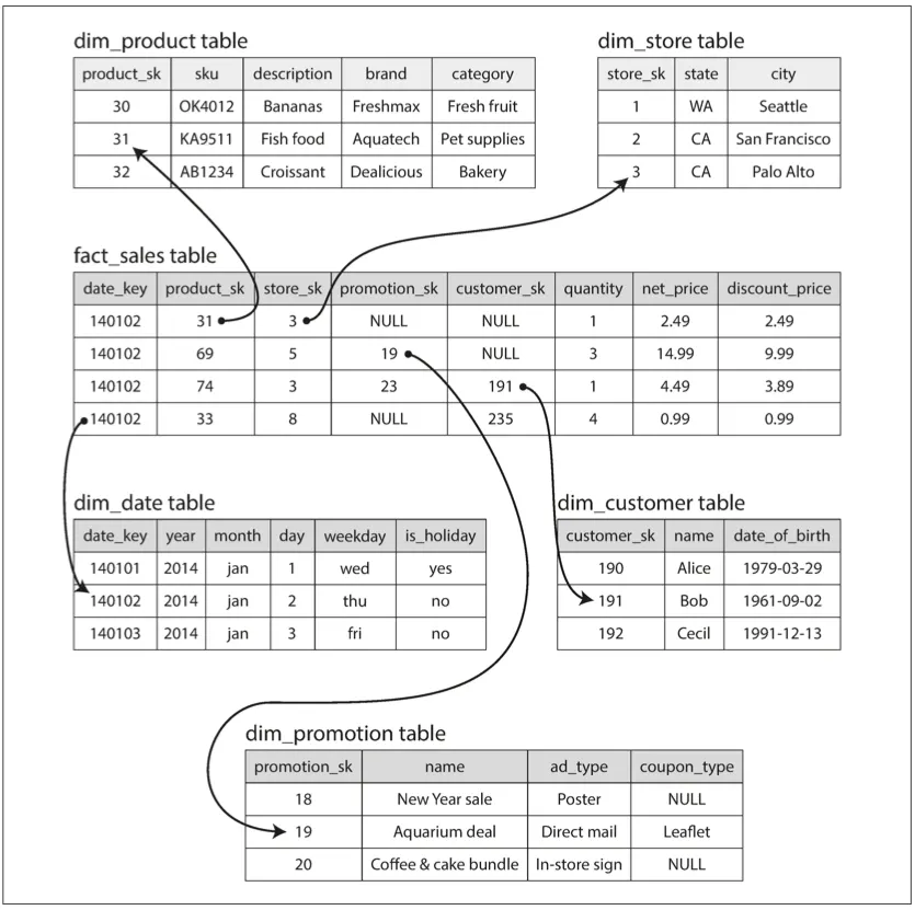 이 그림은 식료품 소매업에서 사용하는 data warehouse 이다. 스키마 중심에 fact table(사실 테이블, 위 그림에서 fact_sales 을 말함)의 각 row는 특정 시각에 발생한 event 에 해당한다.
