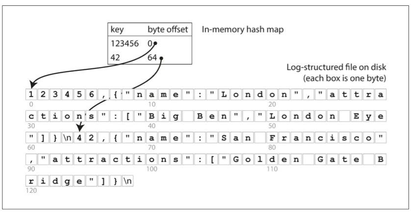 이 방법은 리악의 bitcask 가 사용하는 방식이다. 비트캐스크는 해시맵을 전부 메모리에 유지하기 때문에 RAM에 모든 키가 저장된다는 조건을 전제로 고성능 읽기, 쓰기를 보장한다. 게다가 데이터 파일의 일부가 파일 시스템 캐시에 있다면 읽기에 디스크 입출력도 필요하지 않다.