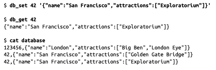 db_set 을 호출할 때 마다 끝에 추가하므로 키를 여러번 갱신해도 예전 값을 덮어 쓰지 않으며, 최신 값은 키의 가장 마지막 항목을 살펴봐야 한다. (tail -n 1 을 실행하는 이유)