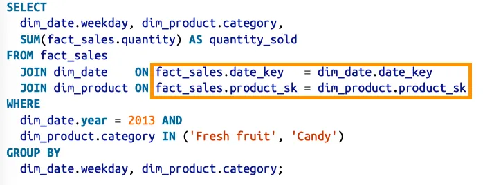 이 예제에서는 하나의 상품이 판매되면, 상품의 정보, 날짜 시간 등을 모두 dimension table 을 통해 표현한다. 이러한 차원 테이블은 추가적인 정보를 부호화할 수 있고 휴일과 평일의 판매 차이를 질의할 수 있다.