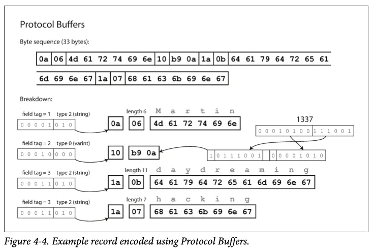 thrift, protocol buffer, avro 같은 이진 스키마 기반은 짧은 길이로 부호화 되어 효율적이고, 정의된 상위 호환성과 하위 호환성이 있다면 효율적인 부호화가 된다.