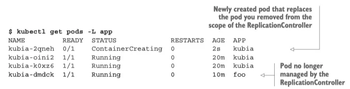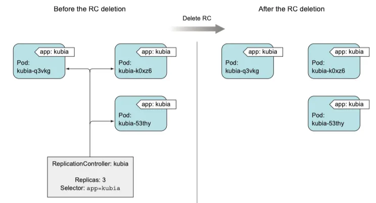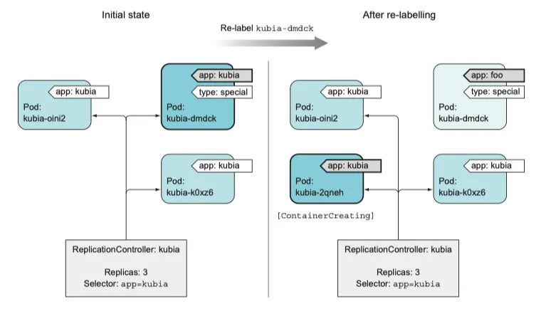 label selector 를 변경하면 기존 파드가 replication controller 의 범위를 벗어나므로 controller 가 해당 pod 에 대한 관리를 중지한다.