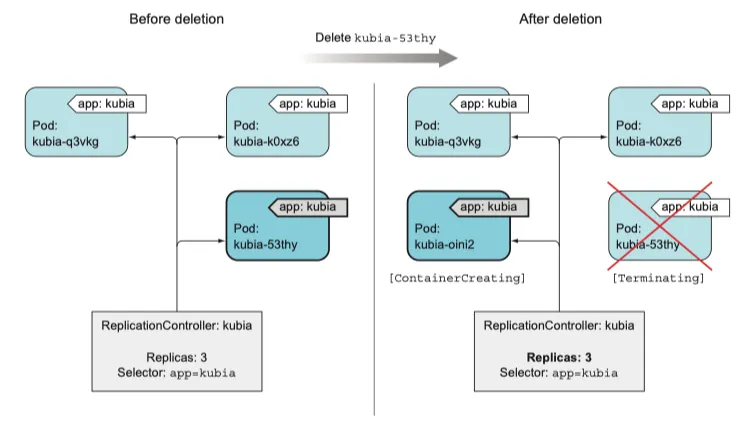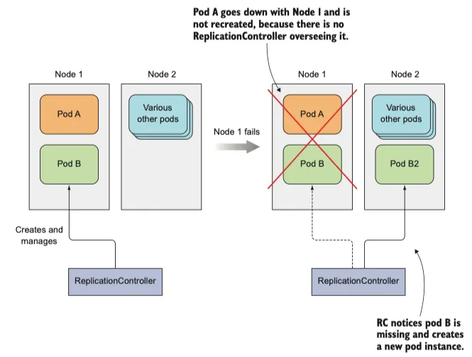node 가 사라지거나 node 에서 pod 가 제거된 경우, replication controller 는 사라진 파드를 감지하고 교체하여 파드를 생성한다.