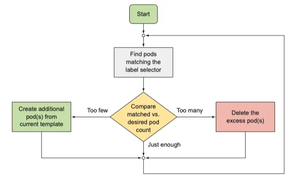 실행 중인 pod 목록을 지속적으로 모니터링 하고, 특정 "type"의 실제 파드 수가 의도하는 수와 일치하는지 항상 확인한다.