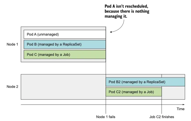 그러나, node 자체에 crash가 발생한 경우 pod 를 재시작 해야하는 것은 controller 의 몫이다.