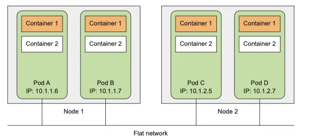 k8s 클러스터는 flat 한 네트워크 주소 공간에 상주 하므로 다른 pod 에 IP 로 접근이 가능하다 각 파드 사이에 NAT는 없다.