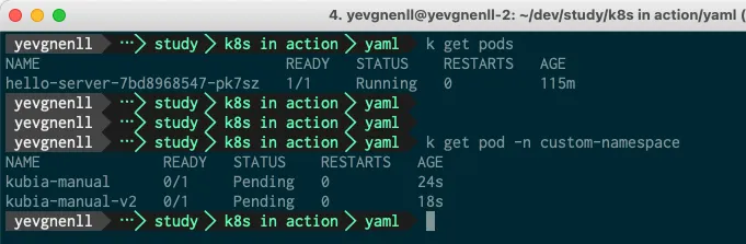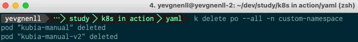 다시 kubia-manual과 kubia-manual-v2 파드를 custom-namespace 로 띄운다
