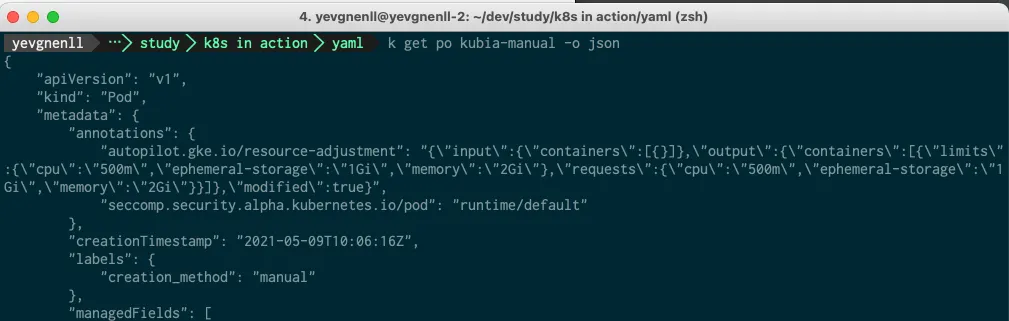 kubectl get po kubia-manual -o yaml|json