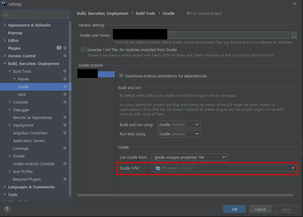File → Settings → Build, Execution, Deployment → Build Tools → Gradle 에서