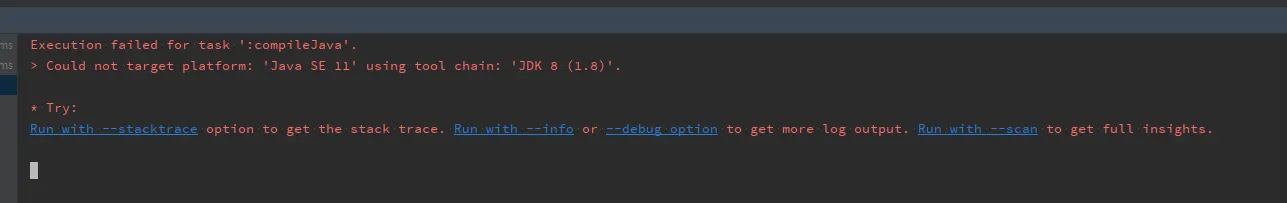 이러한 에러가 발생했다. Java SE 11 이 target 인데 JDK8 버젼으로 수행할 수 없다. 당연한 이야기지