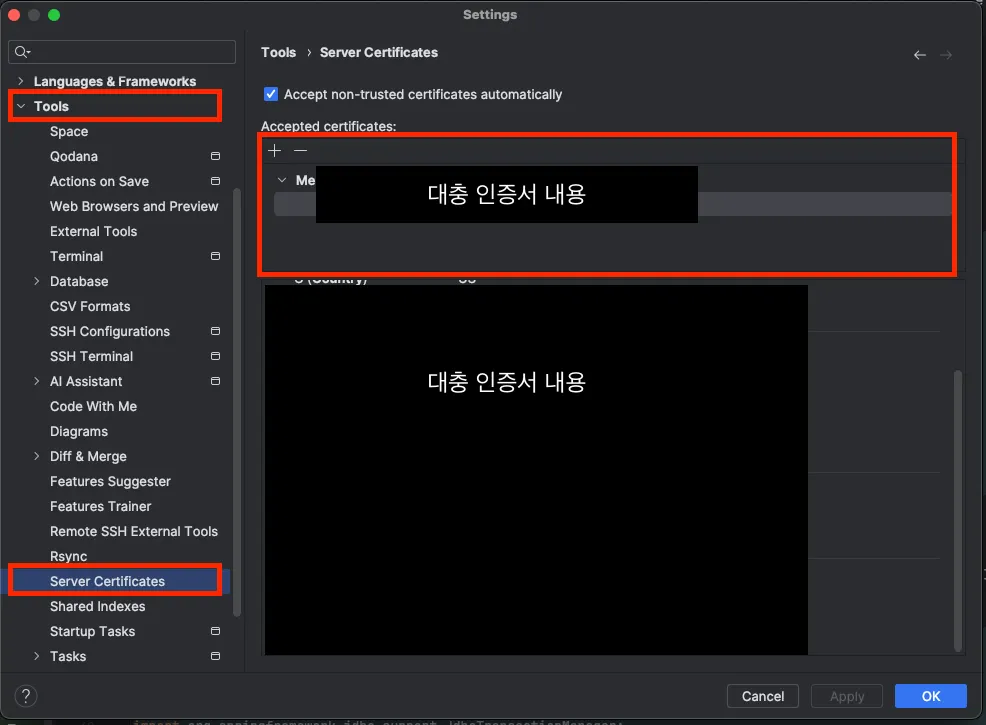 Command + , 로 setting에 들어가면 Tools → Server certificates 가 있다.