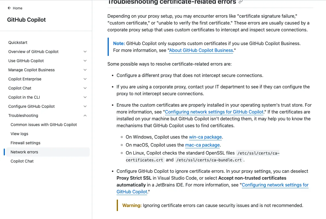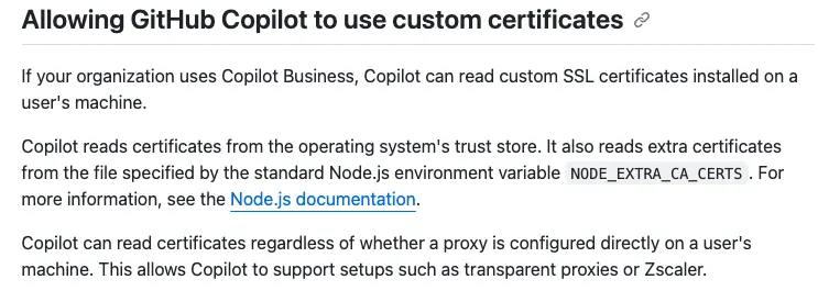 최근 회사에서 copilot 을 지원해주고 베타 테스터로 참여하게 되서 copilot을 연동하며 발견한 unable to get local issuer certificate 이슈를 해결하고자 한다.