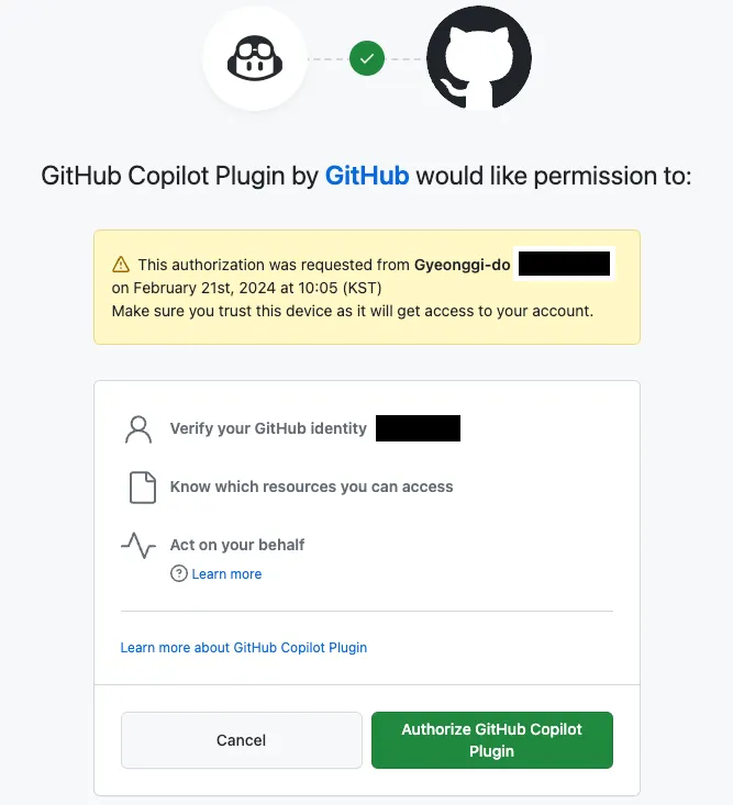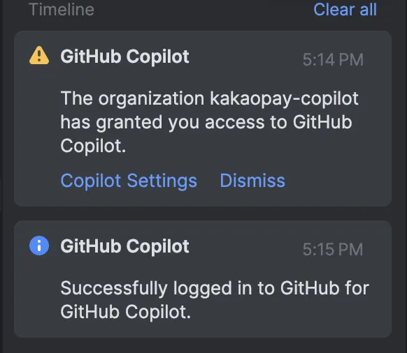 그리고 github copilot 에 로그인하면 다음과 같은 메시지를 확인할 수 있다.