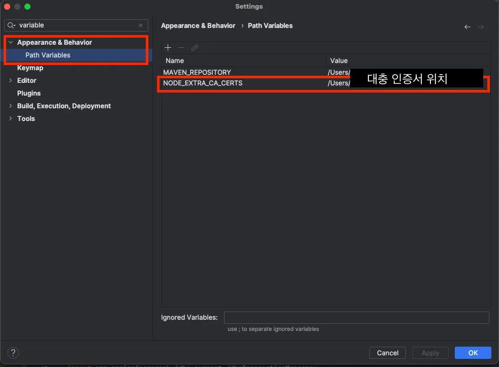 Appearance & Behavior 로 진입하여 Path variables 에 NODE_EXTRA_CA_CERTS 를 추가한다.