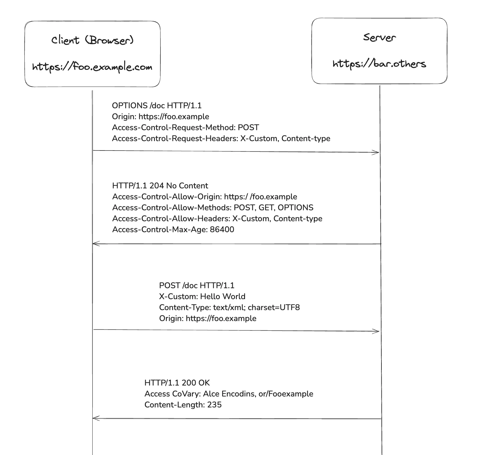 Preflight 의 샘플을 보면 body는 없고 Access-Control- 가 prefix인 헤더가 다양하게 있음을 확인할 수 있다.