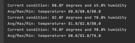 @Test @DisplayName("만들어둔 subject, observer 의 디스플레이 장치가 잘 동작하는지 확인해보자") void printWeatherData() { WeatherData weatherData = new WeatherData(); CurrentConditionDisplay currentDisplay = new CurrentConditionDisplay(weatherData); StatisticsDisplay statisticsDisplay = new StatisticsDisplay(weatherData); weatherData.setMeasurements(80, 65, 30.4f); weatherData.setMeasurements(82, 70, 29.2f); weatherData.setMeasurements(78, 90, 29.2f); }
