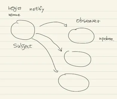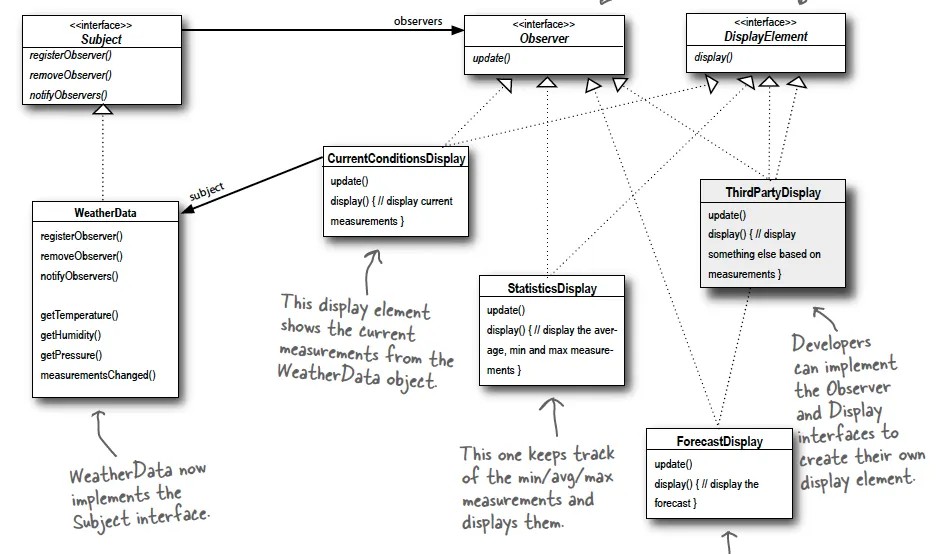 public interface Subject { void registerObserver(Observer o); void removeObserver(Observer o); void notifyObservers(); }