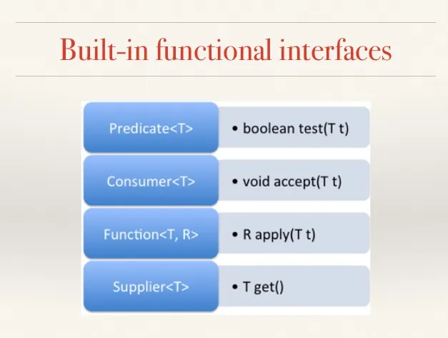 Functional interface 란 abstract method 와 몇몇의 static method 와 default method 가 추가된 인터페이스입니다. java8 에서 추가되면서 우리에게 일상적인 코드를 제거할 수 있게 만들었습니다.