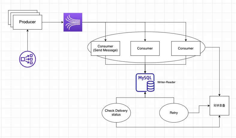 이와 같은 structure 가 있을 때 Consumer 는 메시지를 전송할 때 동일한 메시지가 2번 이상 사용자에게 전달될 수 있다. 그래서 전송 전에 DB에 unique id 는 질의하여 존재하는지 여부를 확인하였다.