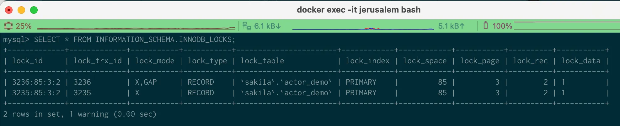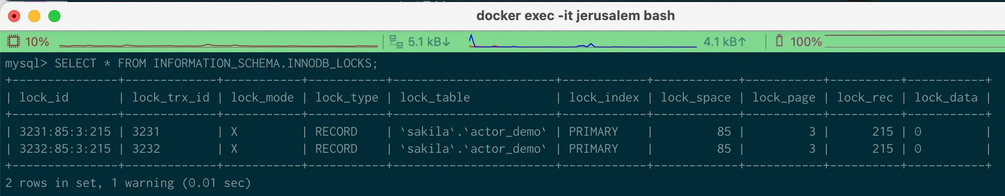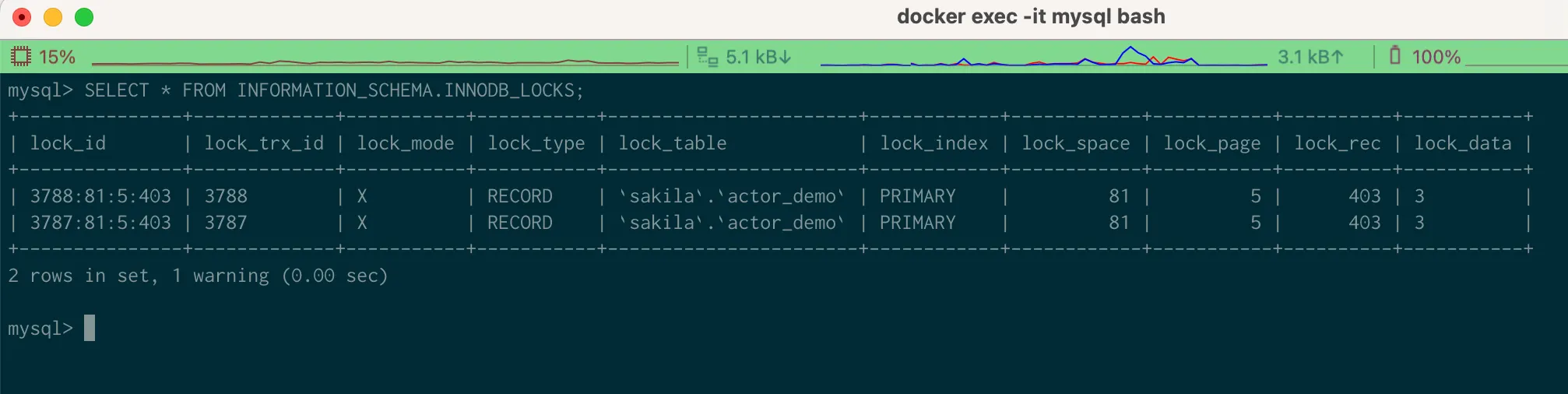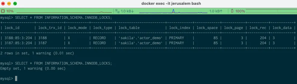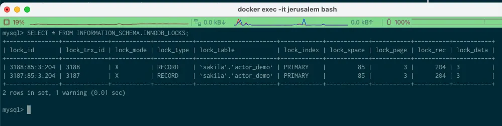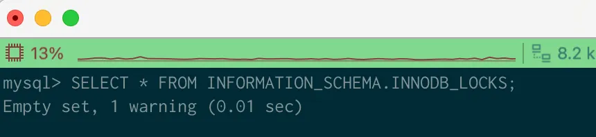 SELECT * FROM INFORMATION_SCHEMA.INNODB_LOCKS;