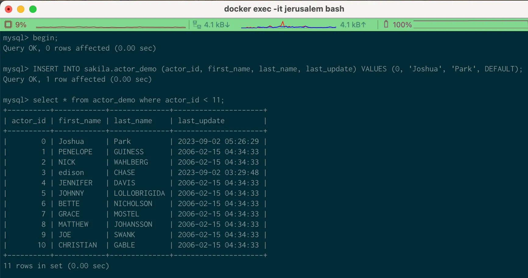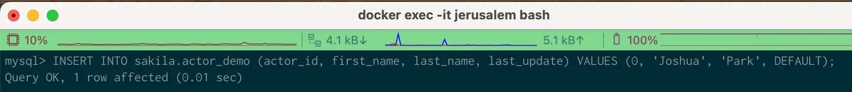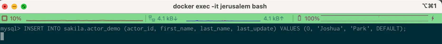 INSERT INTO actor_demo (actor_id, first_name, last_name, last_update) VALUES (0, 'Joshua', 'Park', DEFAULT);