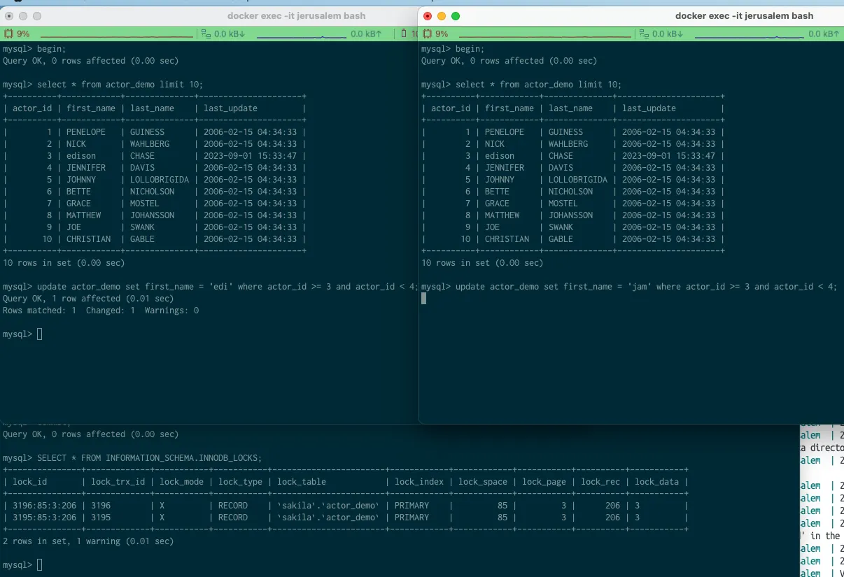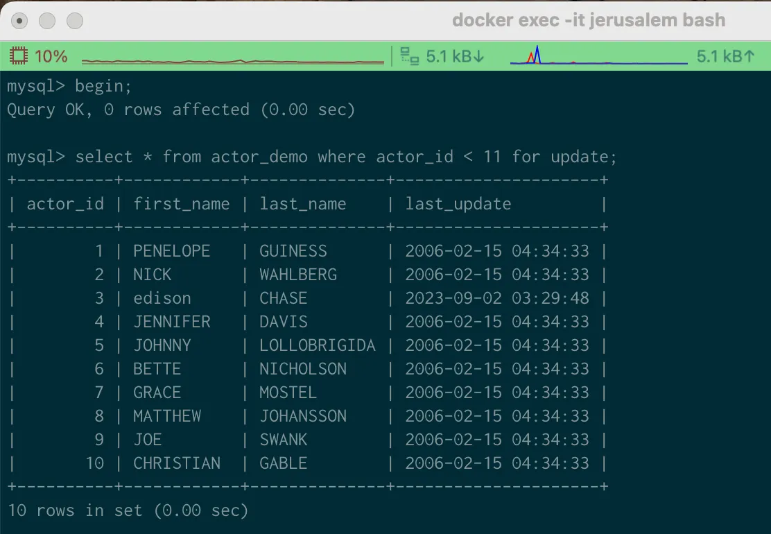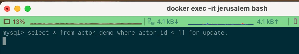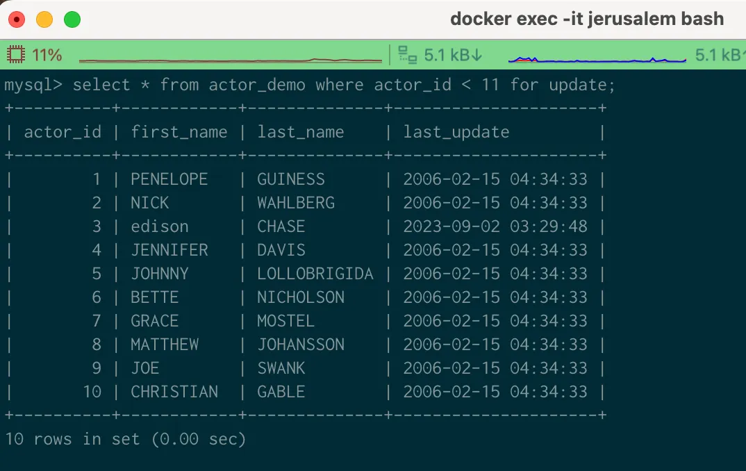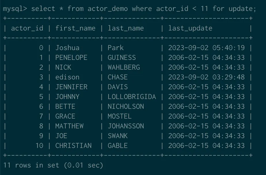 select * from actor_demo where actor_id < 11 for update; 을 수행한다.