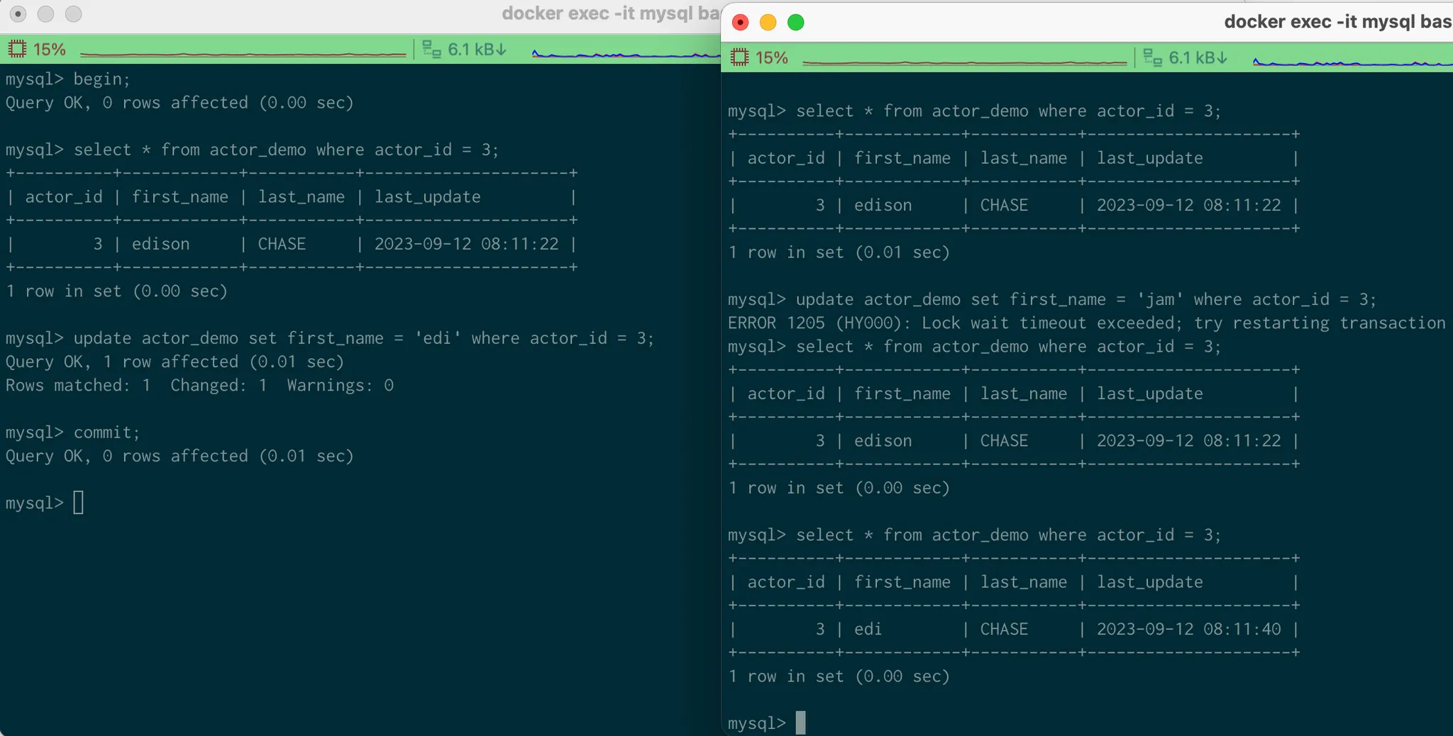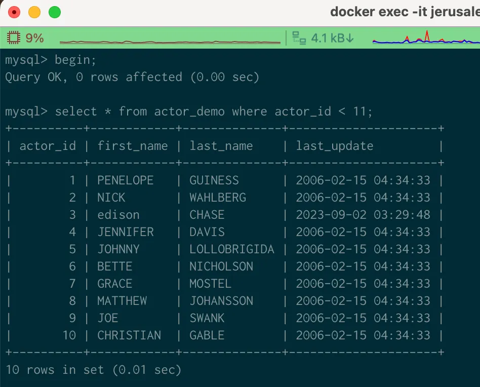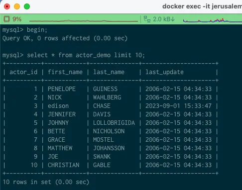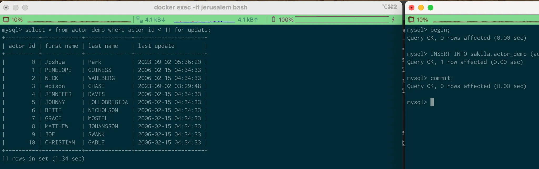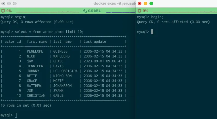 select * from actor_demo where actor_id < 11 for update; 을 수행한다.