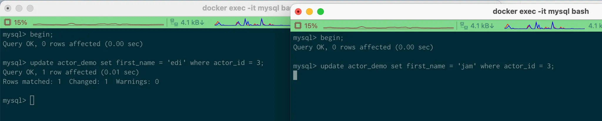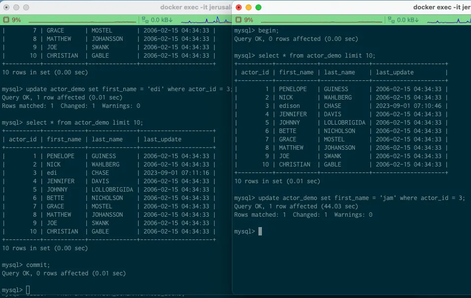 MySQL에서 auto commit을 비활성화 해두지 않으면 각 쿼리에 대해 begin, commit or abort를 자동으로 실행하기 때문에 원하는 실험을 올바르게 수행할 수 없다.