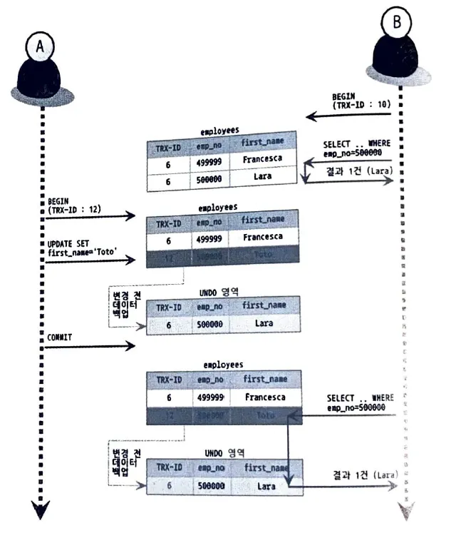 User B 가 5000000 를 select 하면 UNDO 영역의 데이터인 Lara 를 읽게 된다.
