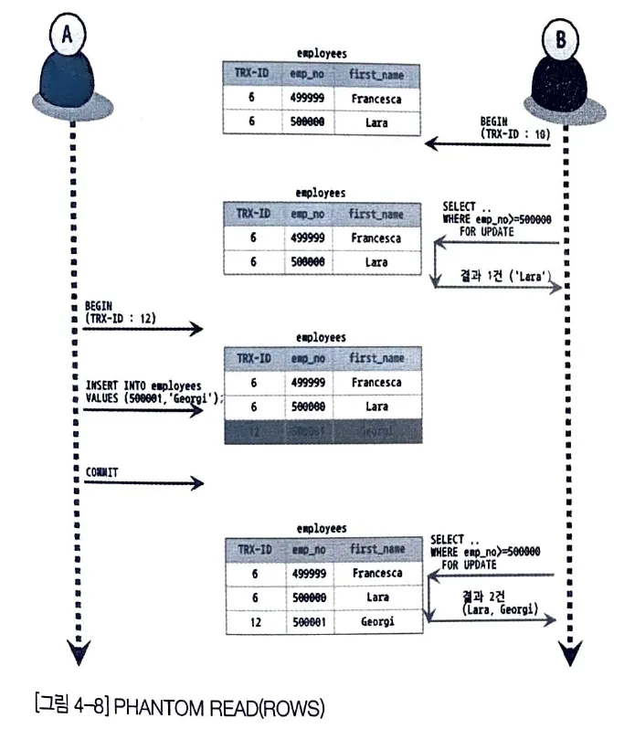 이렇게 다른 transaction에서 수행한 변경 작업에 의해 record 가 보였다가 안보였다가 하는 현상을 Phantom read (또는 Phantom row)라고 한다.