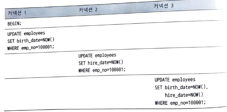 3개의 connection 이 있고 각각 다음과 같은 query 를 실행했다 가정하자