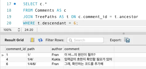 JOIN TreePaths AS t ON c.comment_id = t.descendant