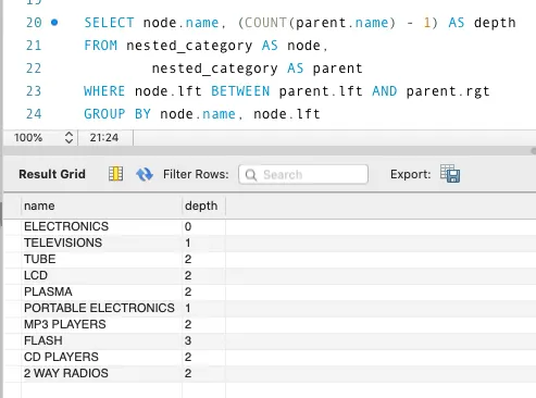 SELECT node.name, (COUNT(parent.name) - 1) AS depth