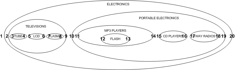 상단에 잘 그려진 tree 이미지 를 확인하면 eletronics → portable eletronics → mp3 player → flash 로 옴을 확인할 수 있다.