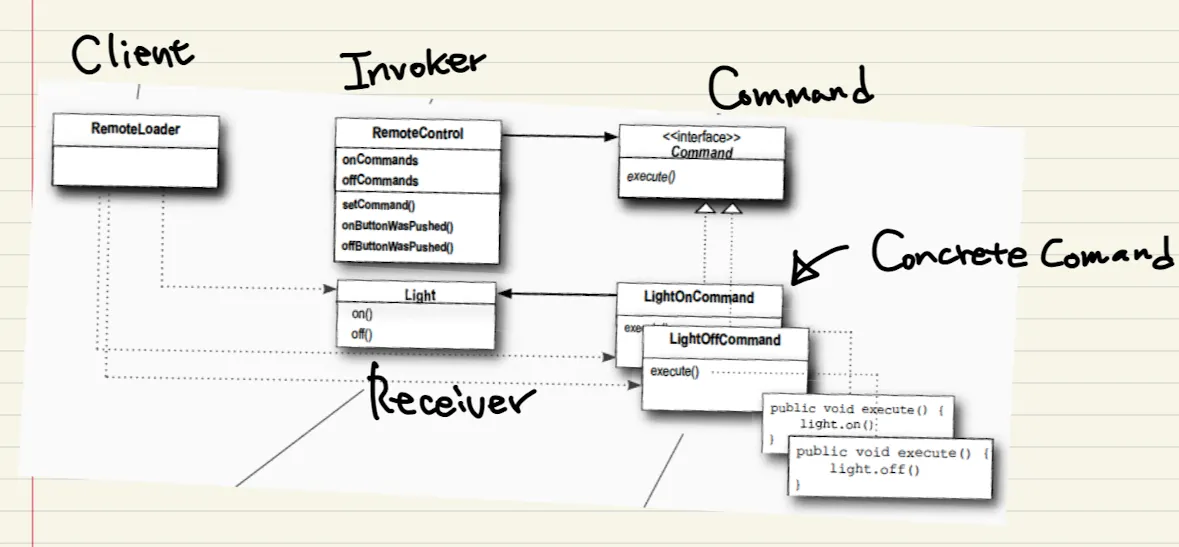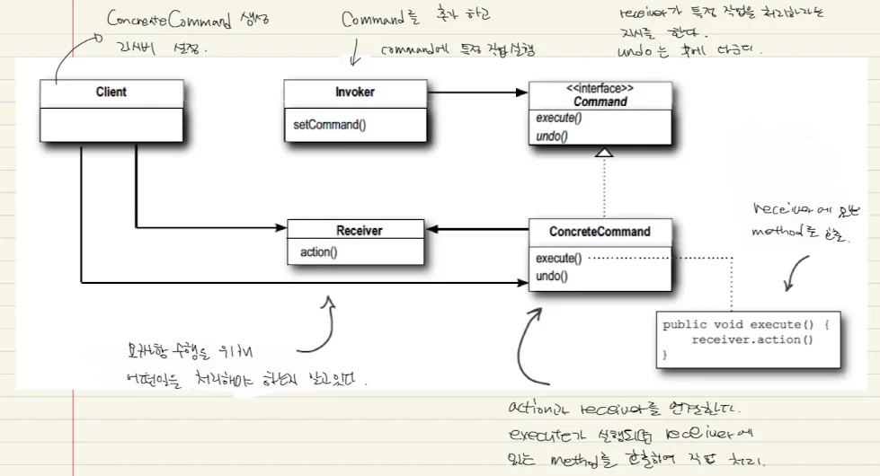 ConcretCommand 는 action과 receiver 를 연결하며 Invoker 에서 execute() 호출을 통해 요청을 하면 리시버에 있는 메소드를 호출하면서 필요한 업무를 수행한다.