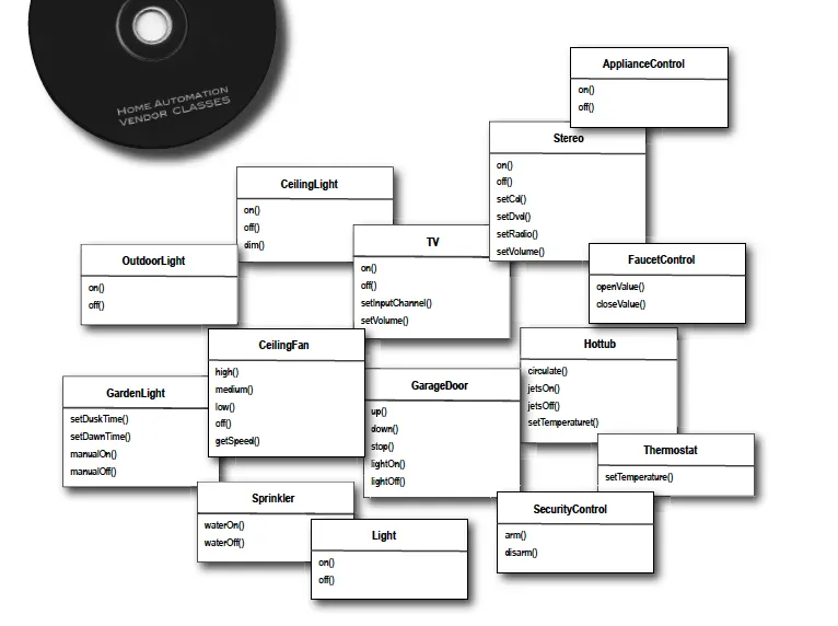 public class Light { public void on() { System.out.println("turn on light"); } public void off() { System.out.println("turn off light"); } }