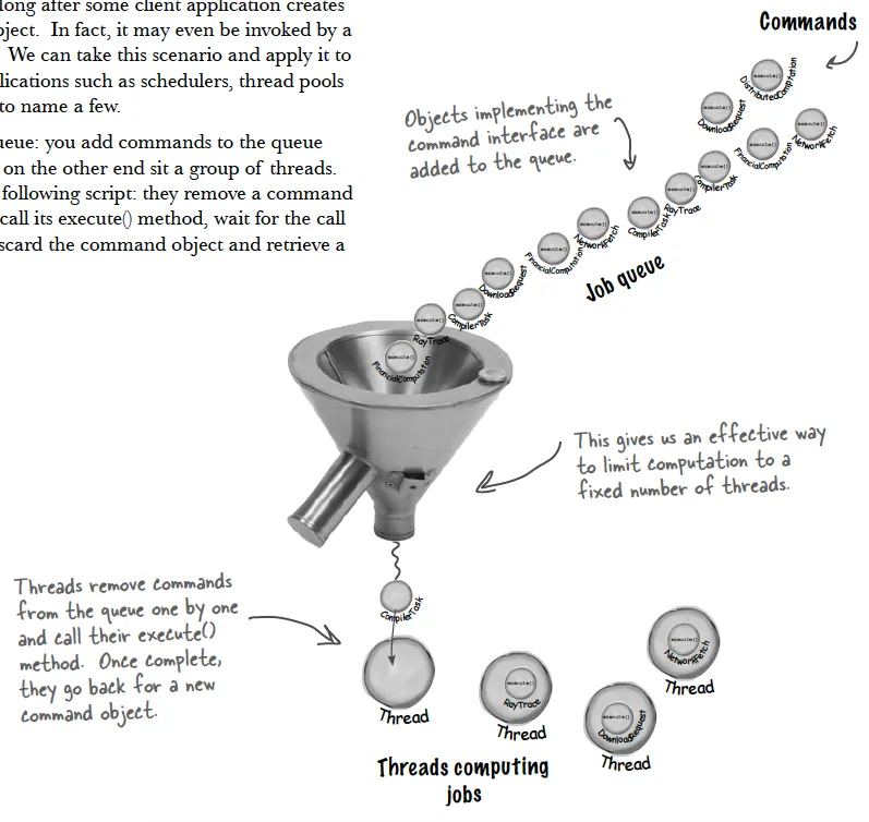큐 한쪽 끝은 command 를 추가하고, 반대쪽 끝에서는 execute() 를 실행하기 위한 Thread 들이 대기하고 있는 것이다.