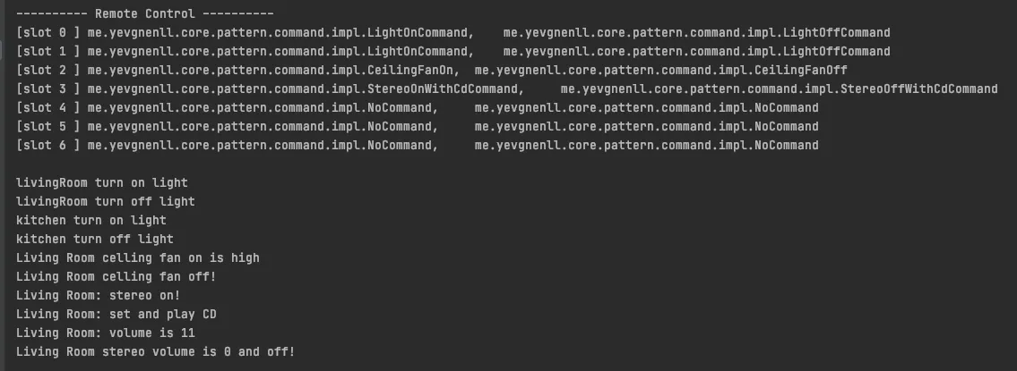 @RequiredArgsConstructor public class StereoOffWithCdCommand implements Command { private final Stereo stereo; @Override public void execute() { stereo.off(); } @Override public void undo() { stereo.on(); stereo.setCd(); stereo.setVolume(11); } }